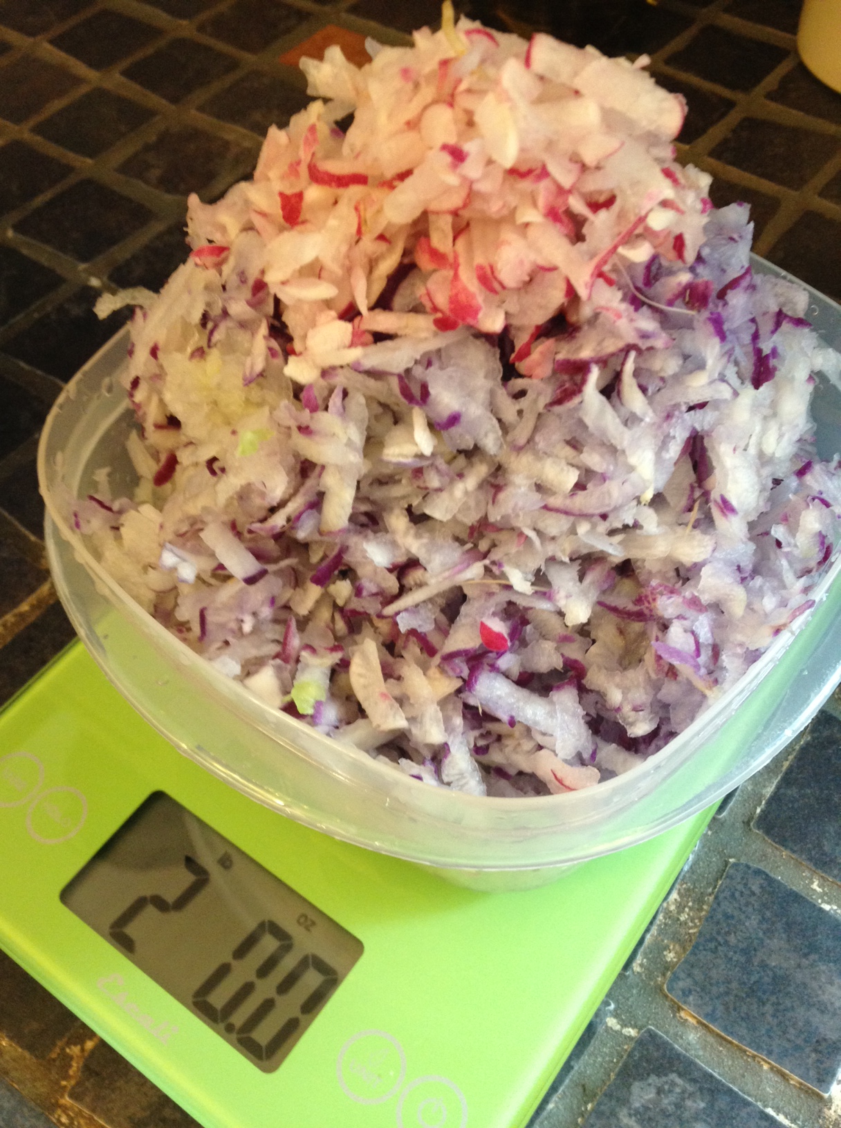 Weighing radishes on my new scale – 2 pounds exactly!