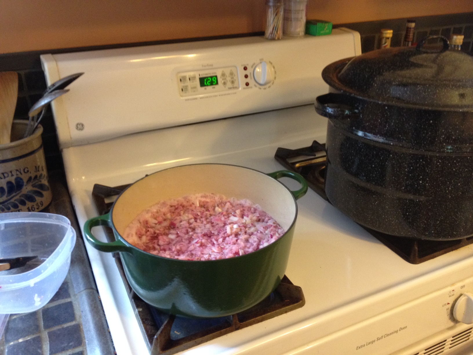 The set up on the stove – the relish boiling next to the canning pot.