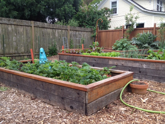 Another shot of some of the vegetable beds. The strawberry bed is the one with the gnome sitting in it. Then we have a bed filled with onions, beets, radishes, lettuce, basil, and escarole. In the background are two beds filled with artichokes, potatoes, rhubarb, cucumbers, and butternut squash.