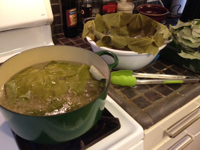 Blanching grape leaves.