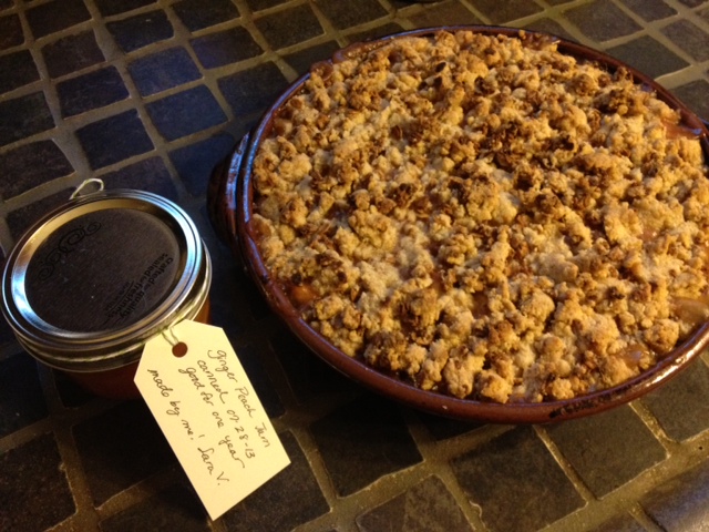 Give the filling a final stir or two and then pour it into the buttered pie plate. Take the crumble topping and sprinkle it as evenly as possible over the entire top of the pie (no big chunks). Place the pie plate on a cookie sheet – we used our pizza pan – to catch any drips in case the filling bubbles over (ours did). Bake in the preheated over for 45-55 minutes. As with all fruit pies let this one cool a bit before you serve/eat some to avoid burning your mouth.